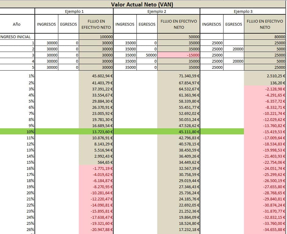 En el artículo anterior, “Tasa de Rentabilidad TIR y Valor Actual Neto VAN”, se explicaron tres casos prácticos. Esos tres ejemplos están incluidos en la plantilla descargable que acompaña este artículo.
